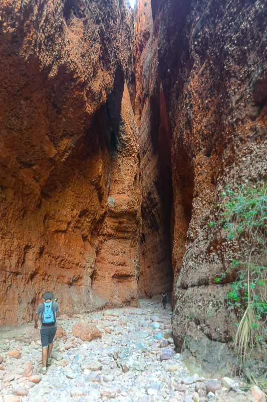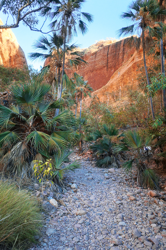 Pour atteindre le début de la gorge depuis le parking, nous avons dû marcher en plein soleil pendant plusieurs minutes dans le lit d’une rivière asséchée. Comme à El Questro, la végétation y était luxuriante, créant l’impression d’être dans un oasis.