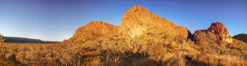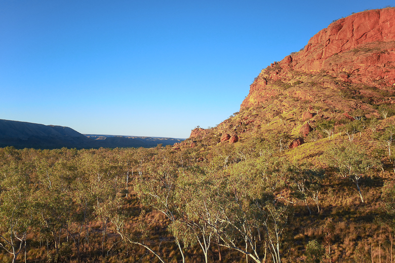 Nous avons poursuivi notre visite par Osmand Lookout. Ce point de vue est facile d’accès, situé à 600 m du parking (le même que pour Echidna Chasm). Nous y sommes arrivés en fin de journée, et la lumière du soleil couchant accentuait la couleur orange de la roche. Cette superbe vue nous offrait un préambule sur les dômes de Purnululu, les célèbres Bungle Bungle que nous découvririons le lendemain.